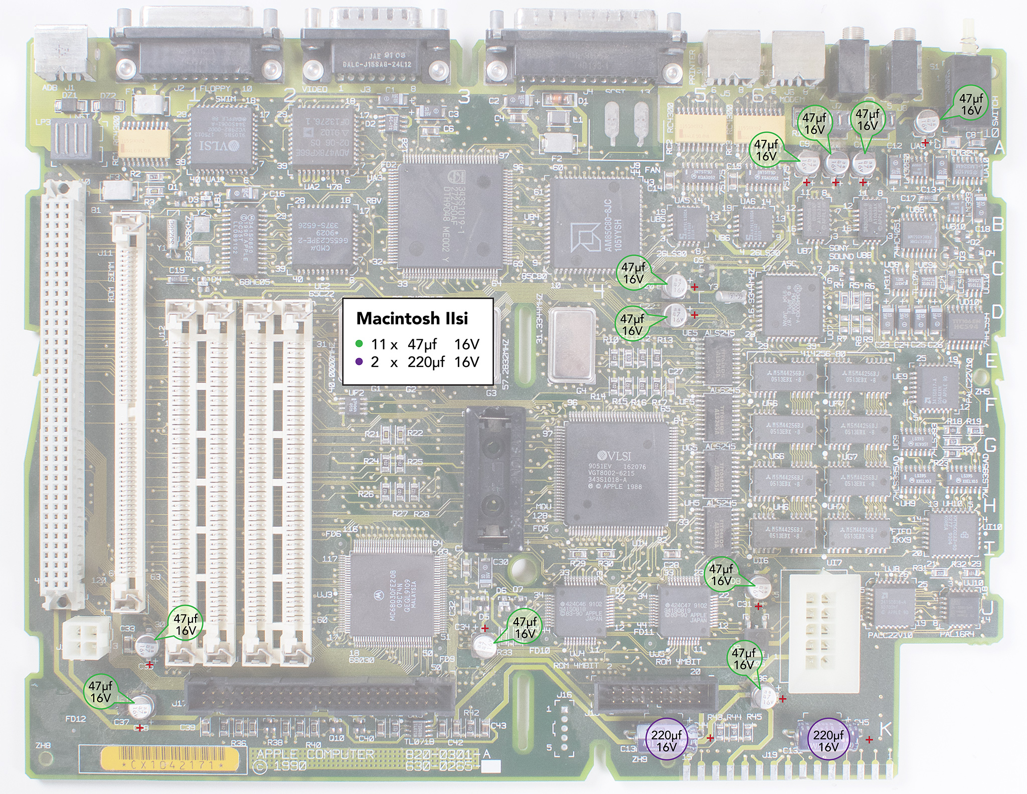 Macintosh IIsi logic board capacitor replacement guide. Source: Recap-a-Mac (recapamac.com.au)